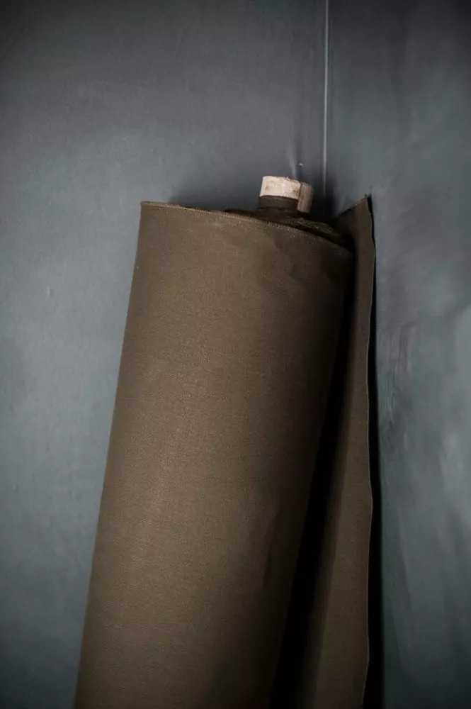 Self - Sturdy Ecru Japanese Washed Cotton Canvas. Lining - Black Ticking Extra Wide. Base - Camping Green Japanese Washed Cotton Canvas. Webbing - Ecru.